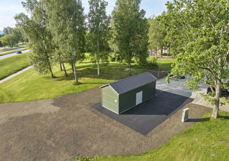 Teknikhuset opbygges i en galvaniseret stålkonstruktion, isoleres iht. gældende energikrav og leveres færdigmonteret med alt teknisk udstyr: pumpe, veksler, shunt, måler og styring – alt testet og CE-mærket inden levering. Indvendigt opdeles huset typisk i el- og maskinrum med isoleret skillevæg og adgang via dobbeltdøre.